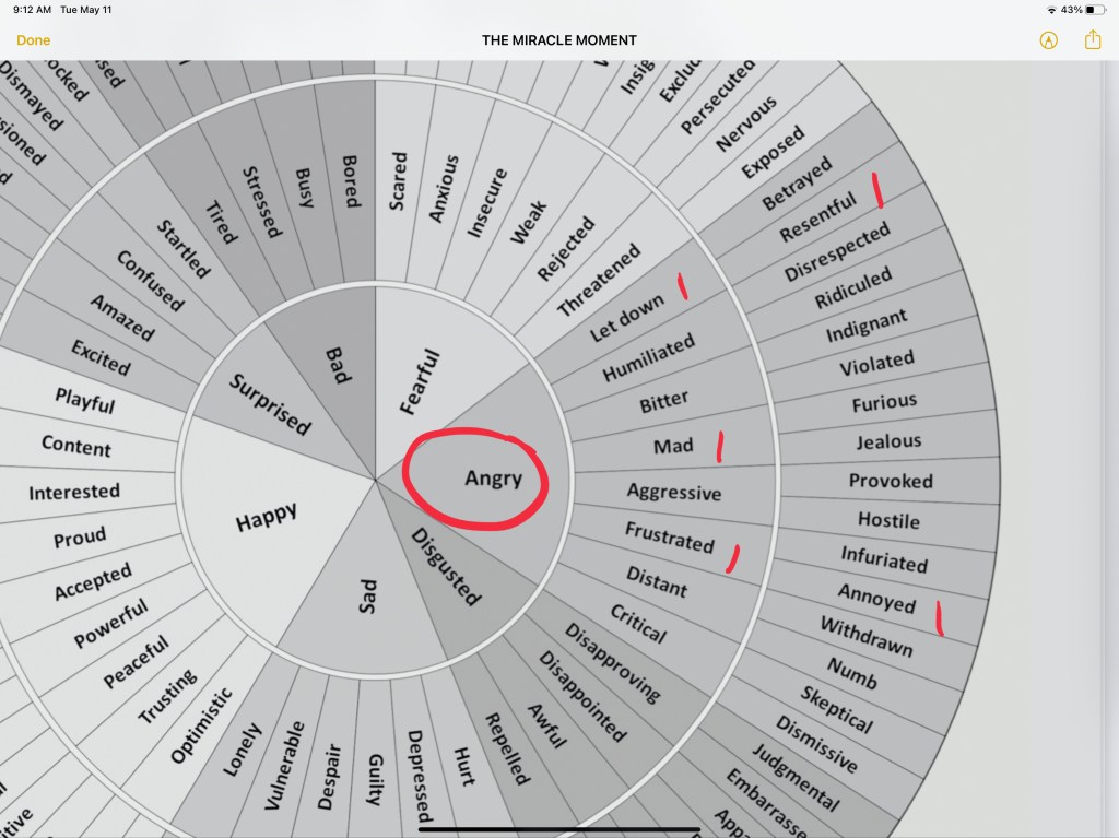 Nicole talks about owning our true feelings and speaking them. The actual truth. She even provides a Feeling Wheel as a resource (Side bar – I love this so much – I not have it pinned as an image on my phone). So in the heat of the moment when I felt myself feeling this intense emotion, I quickly grabbed my feeling chart and decided to put Nicole’s theory to the test. Here is what I noted.